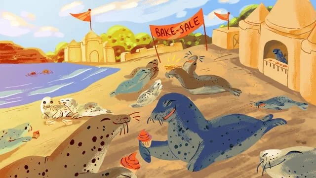a set of frame-by-frame animated illustrations showcasing critters in unique environments, from a pumpkin patch to a desert bazaar to a beachside bake sale.