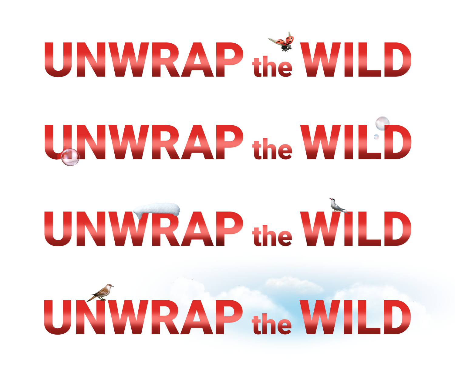 Titles for the campaign, shaded with a reflective gradient to match the ribbons and satin used in the graphics. The title was customized for different environments, reflecting the animals being promoted.